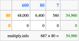 That's all there is to it! As you can see from the box above, the answer to 687 times 80 using the box method is 54,960.