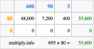 Below is an illustration showing you how to calculate 695 times 80 using the box method, using the instructions above.