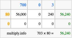 That's all there is to it! As you can see from the box above, the answer to 703 times 80 using the box method is 56,240.