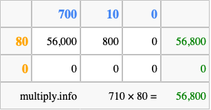 Below is an illustration showing you how to calculate 710 times 80 using the box method, using the instructions above.