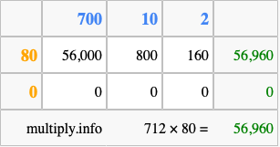 That's all there is to it! As you can see from the box above, the answer to 712 times 80 using the box method is 56,960.