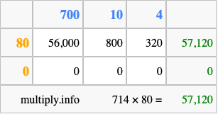 That's all there is to it! As you can see from the box above, the answer to 714 times 80 using the box method is 57,120.
