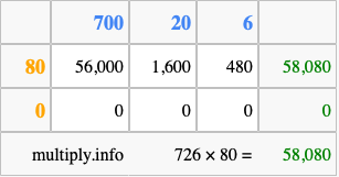 Below is an illustration showing you how to calculate 726 times 80 using the box method, using the instructions above.