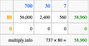 That's all there is to it! As you can see from the box above, the answer to 737 times 80 using the box method is 58,960.