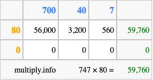 That's all there is to it! As you can see from the box above, the answer to 747 times 80 using the box method is 59,760.