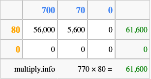 That's all there is to it! As you can see from the box above, the answer to 770 times 80 using the box method is 61,600.