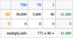 That's all there is to it! As you can see from the box above, the answer to 771 times 80 using the box method is 61,680.