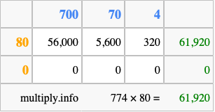 Below is an illustration showing you how to calculate 774 times 80 using the box method, using the instructions above.