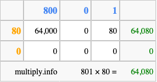 Finally, we add up all the sums we found in step 3 to get our final answer to 801 times 80.