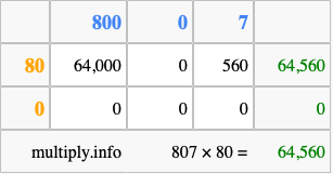 That's all there is to it! As you can see from the box above, the answer to 807 times 80 using the box method is 64,560.