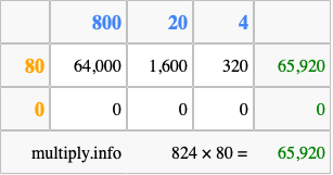Finally, we add up all the sums we found in step 3 to get our final answer to 824 times 80.