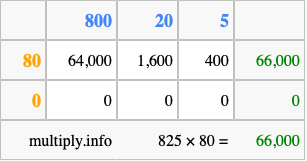 Below is an illustration showing you how to calculate 825 times 80 using the box method, using the instructions above.