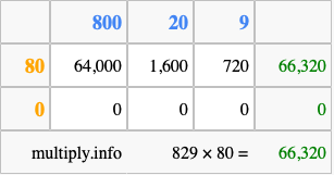 That's all there is to it! As you can see from the box above, the answer to 829 times 80 using the box method is 66,320.