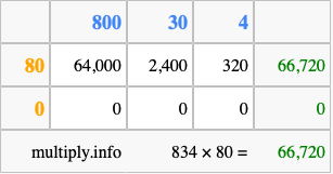 Finally, we add up all the sums we found in step 3 to get our final answer to 834 times 80.