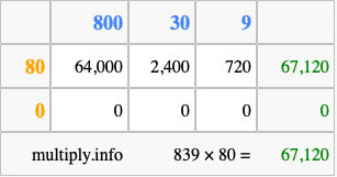 Finally, we add up all the sums we found in step 3 to get our final answer to 839 times 80.