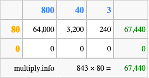 That's all there is to it! As you can see from the box above, the answer to 843 times 80 using the box method is 67,440.