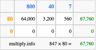 Below is an illustration showing you how to calculate 847 times 80 using the box method, using the instructions above.