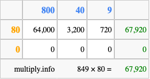 That's all there is to it! As you can see from the box above, the answer to 849 times 80 using the box method is 67,920.