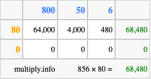 Below is an illustration showing you how to calculate 856 times 80 using the box method, using the instructions above.