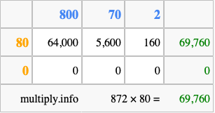 That's all there is to it! As you can see from the box above, the answer to 872 times 80 using the box method is 69,760.