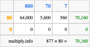 That's all there is to it! As you can see from the box above, the answer to 877 times 80 using the box method is 70,160.