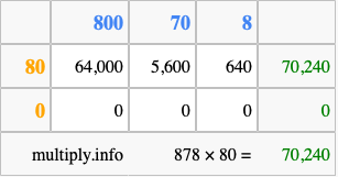 That's all there is to it! As you can see from the box above, the answer to 878 times 80 using the box method is 70,240.