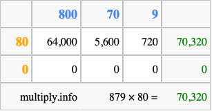 Finally, we add up all the sums we found in step 3 to get our final answer to 879 times 80.