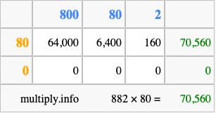 That's all there is to it! As you can see from the box above, the answer to 882 times 80 using the box method is 70,560.