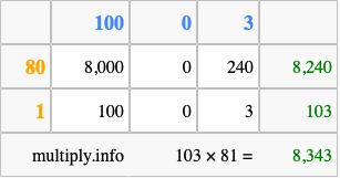 Below is an illustration showing you how to calculate 103 times 81 using the box method, using the instructions above.
