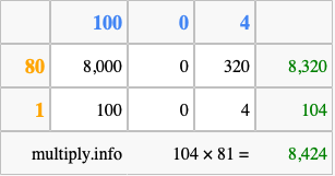 Finally, we add up all the sums we found in step 3 to get our final answer to 104 times 81.