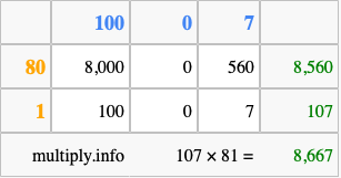 Below is an illustration showing you how to calculate 107 times 81 using the box method, using the instructions above.