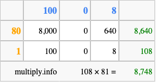That's all there is to it! As you can see from the box above, the answer to 108 times 81 using the box method is 8,748.