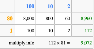 Below is an illustration showing you how to calculate 112 times 81 using the box method, using the instructions above.