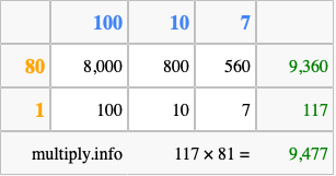 That's all there is to it! As you can see from the box above, the answer to 117 times 81 using the box method is 9,477.