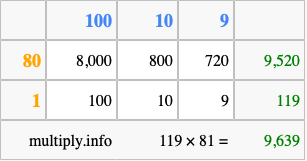 Finally, we add up all the sums we found in step 3 to get our final answer to 119 times 81.