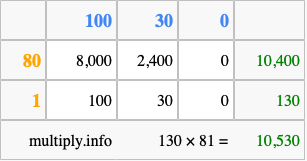 That's all there is to it! As you can see from the box above, the answer to 130 times 81 using the box method is 10,530.