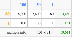 Finally, we add up all the sums we found in step 3 to get our final answer to 131 times 81.