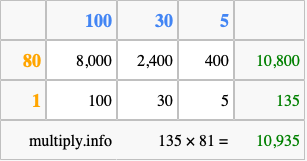Finally, we add up all the sums we found in step 3 to get our final answer to 135 times 81.