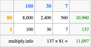 Finally, we add up all the sums we found in step 3 to get our final answer to 137 times 81.