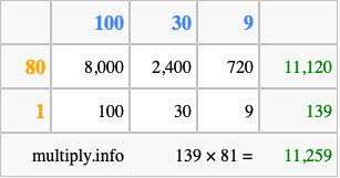 That's all there is to it! As you can see from the box above, the answer to 139 times 81 using the box method is 11,259.