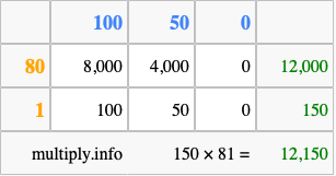 Finally, we add up all the sums we found in step 3 to get our final answer to 150 times 81.