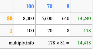 That's all there is to it! As you can see from the box above, the answer to 178 times 81 using the box method is 14,418.