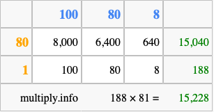 Finally, we add up all the sums we found in step 3 to get our final answer to 188 times 81.
