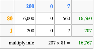 That's all there is to it! As you can see from the box above, the answer to 207 times 81 using the box method is 16,767.