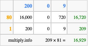 Finally, we add up all the sums we found in step 3 to get our final answer to 209 times 81.