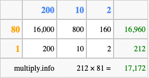 Finally, we add up all the sums we found in step 3 to get our final answer to 212 times 81.