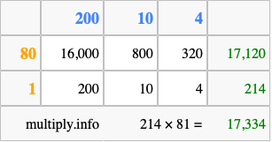 Finally, we add up all the sums we found in step 3 to get our final answer to 214 times 81.