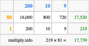 That's all there is to it! As you can see from the box above, the answer to 219 times 81 using the box method is 17,739.