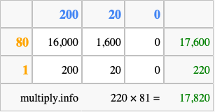 That's all there is to it! As you can see from the box above, the answer to 220 times 81 using the box method is 17,820.