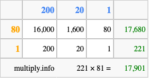 Finally, we add up all the sums we found in step 3 to get our final answer to 221 times 81.